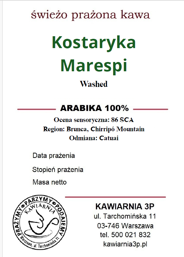 Nowa kawa w ofercie 3P pochodzi z Kostaryki, a dokładnie z plantacji Marespi należącej obecnie do trzech pokoleń rodziny Rafaela Marina i Sylvii Espinozy. Uprawiana na wysokości 1600-1800 m. n.p.m., po zebraniu jest poddawana obróbce na mokro, kryje w sobie smakowe nuty cytrusów, ciastka brownie i wiciokrzewu jaśminowego.
